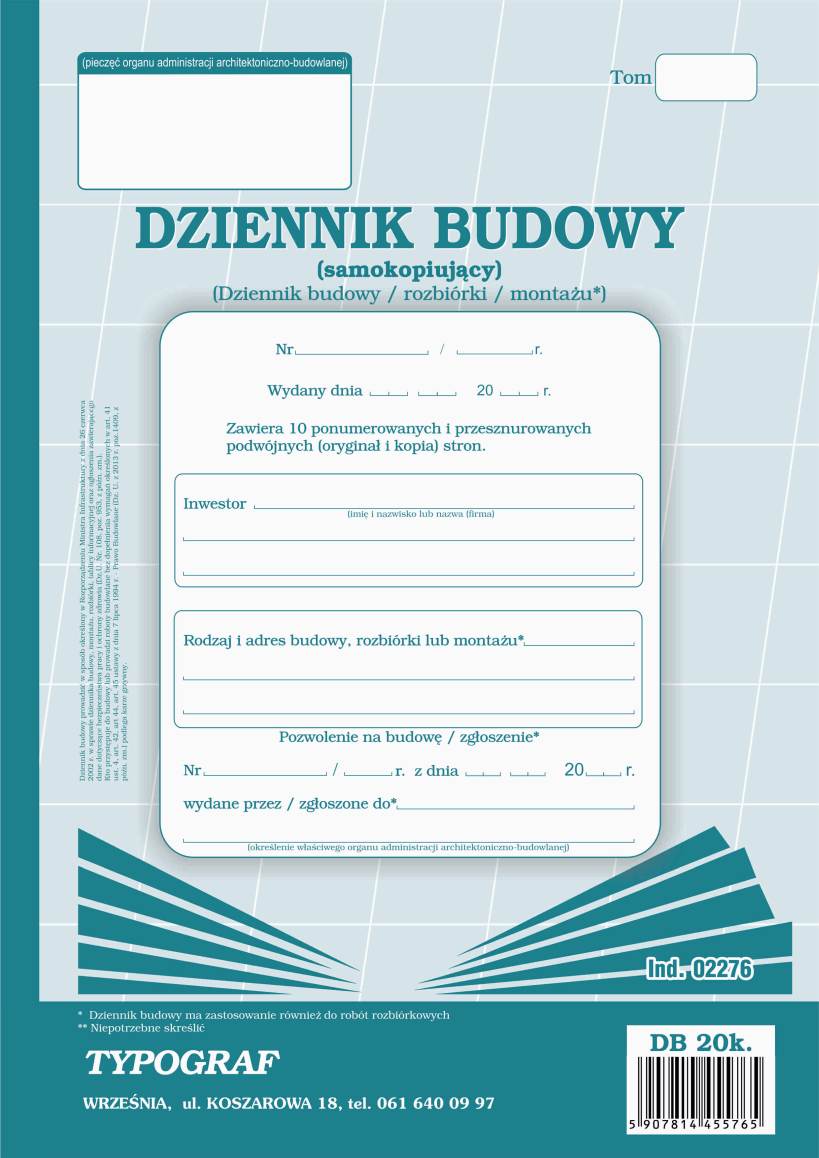 Dziennik budowy A4 20 numerowanych stron (10 orginał + 10 kopia) samokopiujący 02276 TYPOGRAF