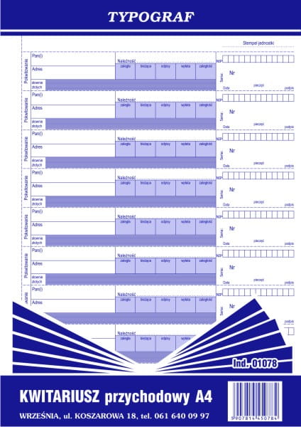 KWITARIUSZ PRZYCHODOWY A4 (30 kartek) 01078 K-104 NUMEROWANY TYPOGRAF