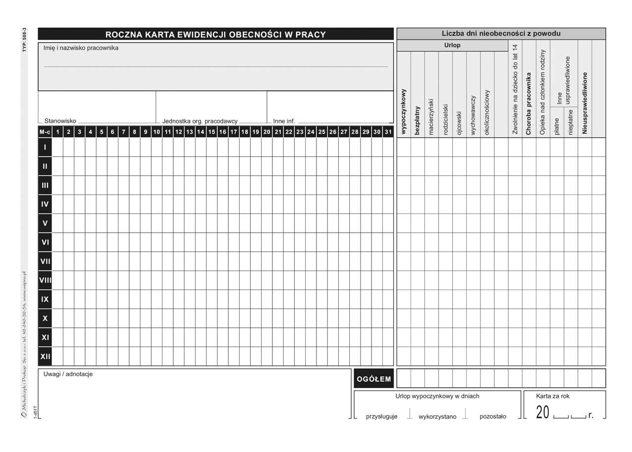 ROCZNA KARTA EWIDENCJI OBECNOŚCI W PRACY A5 /50/ 508-3 M&P OFFSETOWE