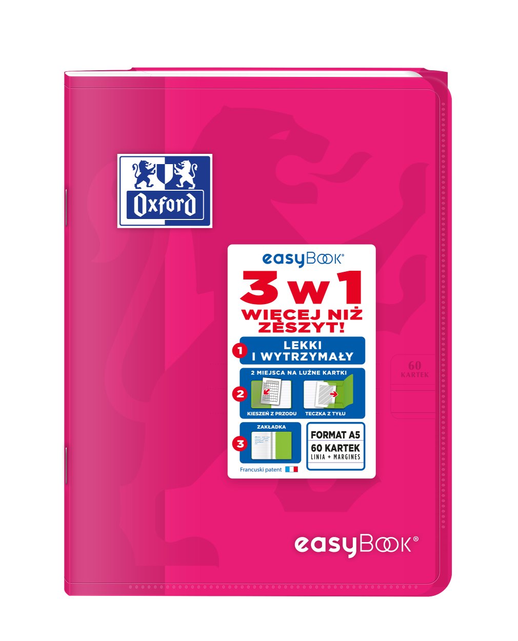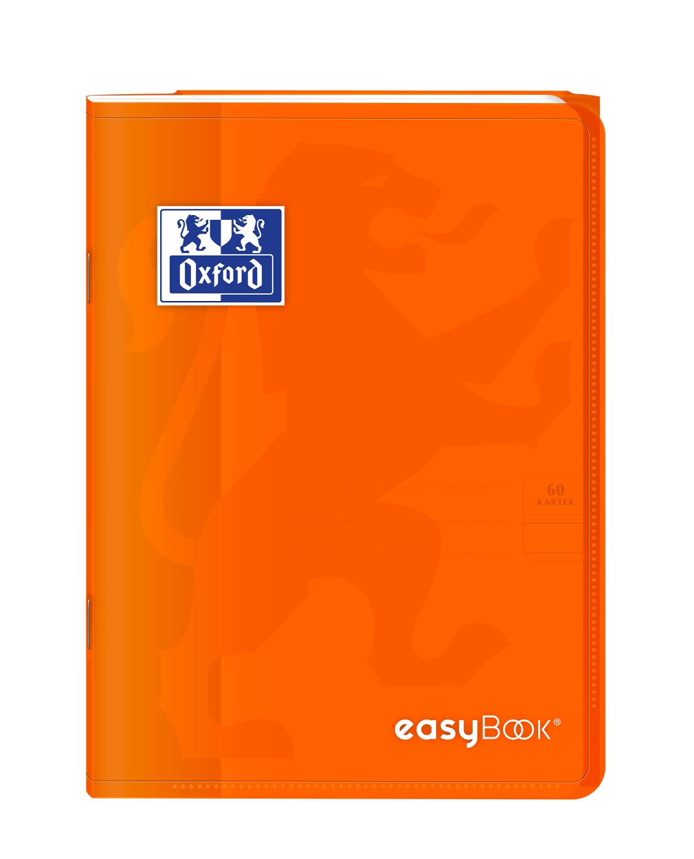 Kolekcja EasyBook to zeszyty z półprzezroczystą, trwałą polipropylenową okładką oraz przedstawionym wizerunkiem lwa. Na przodzie zeszytu znajduje się bardzo praktyczna kieszeń na luźne kartki, natomiast na końcu zeszytu teczka na dokumenty, której skrzydło służy również jako zakładka. Śnieżnobiały i idealnie gładki papier Optik Paper o gramaturze 90 g/m2 sprawi, że pisanie w zeszycie będzie przyjemnością.